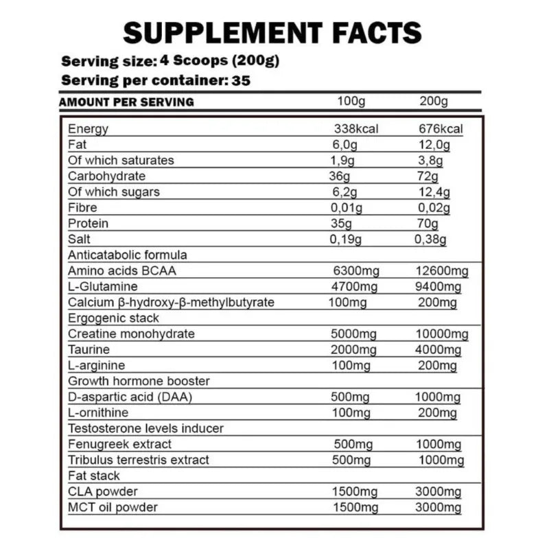 • High-Calorie Formula: Each serving contains 676 calories, making it ideal for athletes aiming to gain lean muscle mass and maintain energy levels.