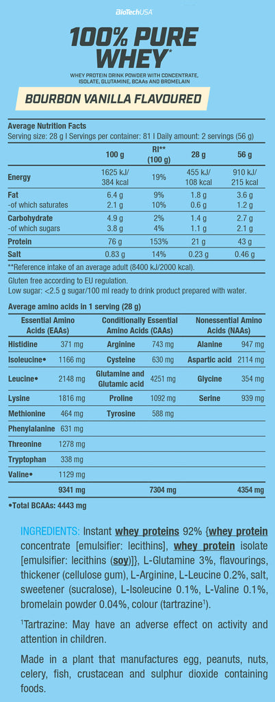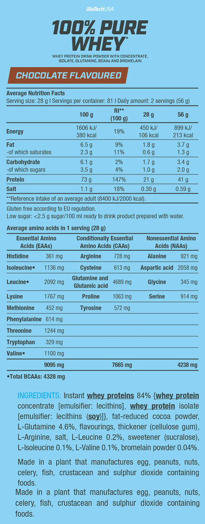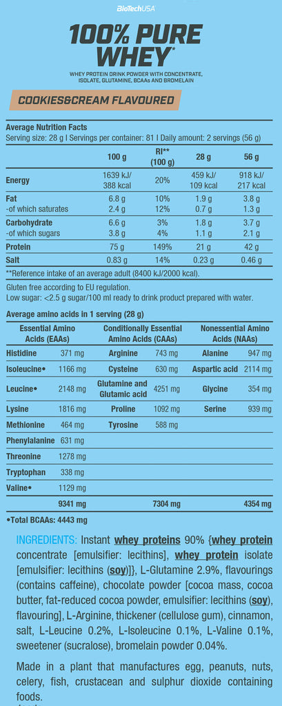 It is a high-quality protein shake with a high BV (biological value) and 78% protein content that is 100% derived from whey protein. The wide-ranging flavours of 100% Pure Whey is a combination of whey protein concentrate, whey protein isolate and added amino acids (L-glutamine, L-arginine and BCAAs).